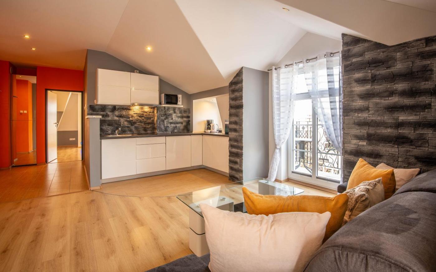 Oferta apartamentu obejmuje sypialnię (1), salon, aneks kuchenny z pełnym wyposażeniem, w tym lodówką i ekspresem do kawy, a także łazienkę (1) z prysznicem oraz suszarką do włosów. W apartamencie zapewniono ręczniki i pościel.